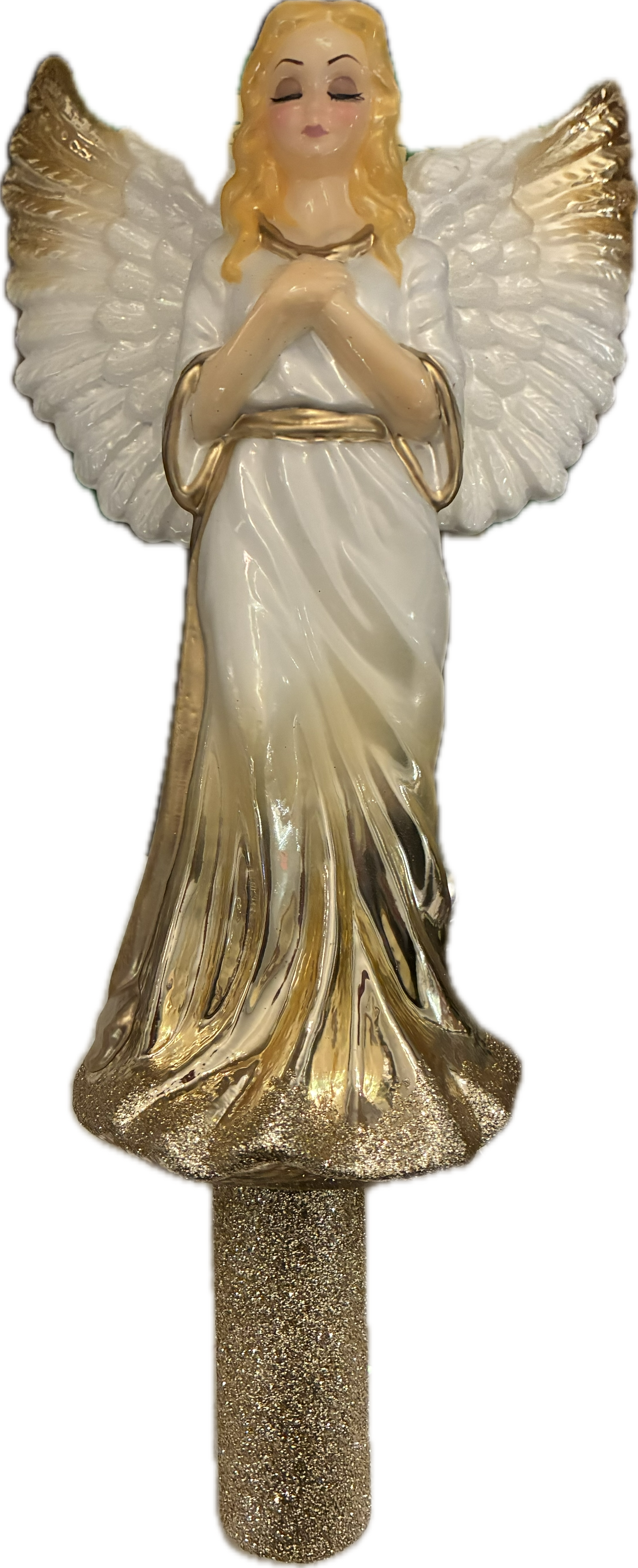 Every Christmas tree needs a glorious Topper to be complete! This golden hair Angel is serene with her white and golden gown. Her wings are wing with glitter and tipped in golden paint. Her stem is golden glitter. Hand crafted in Poland. Measures approximately 15 inches tall and 7 inches wide.