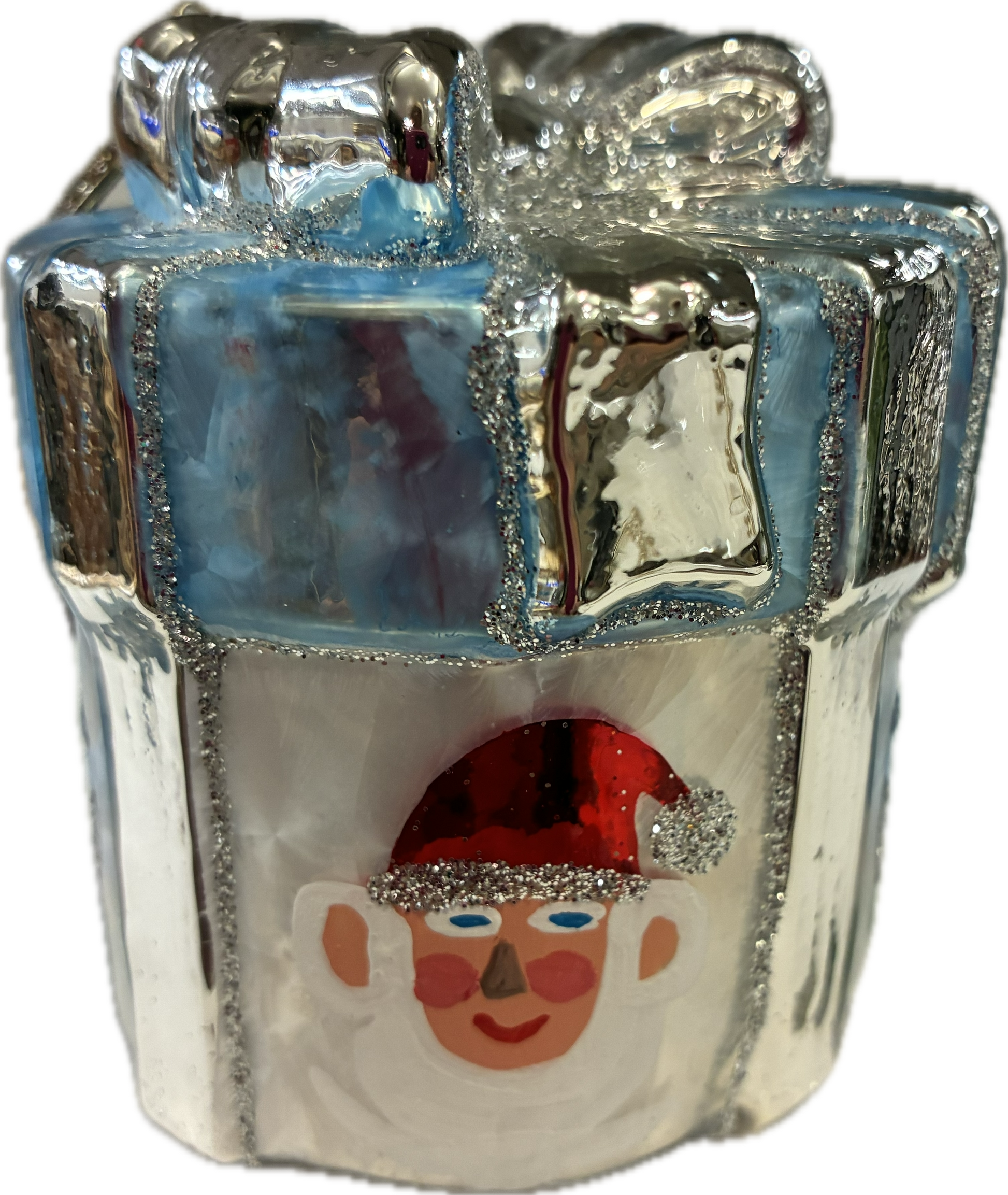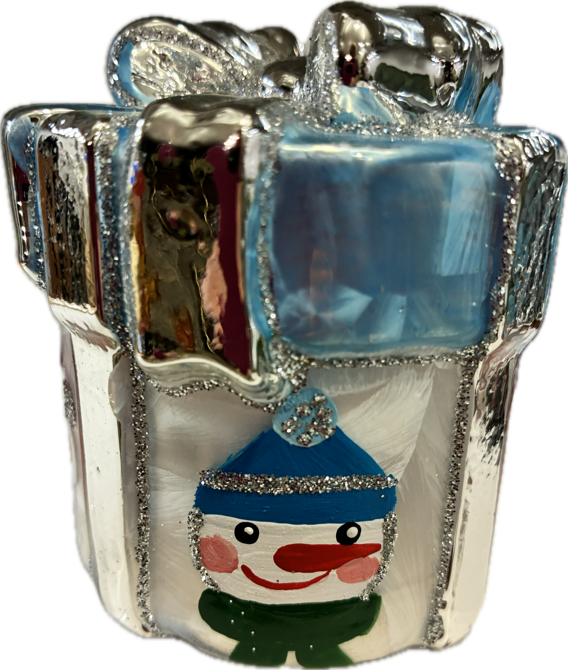 This nostalgic gift shaped ornament features Santa and Mr. Snowy with a snowy background. The blue topped gift is adorned with a silver bow. Hand crafted in Poland. Measures 2.5 inches tall and 2.5 inches wide.