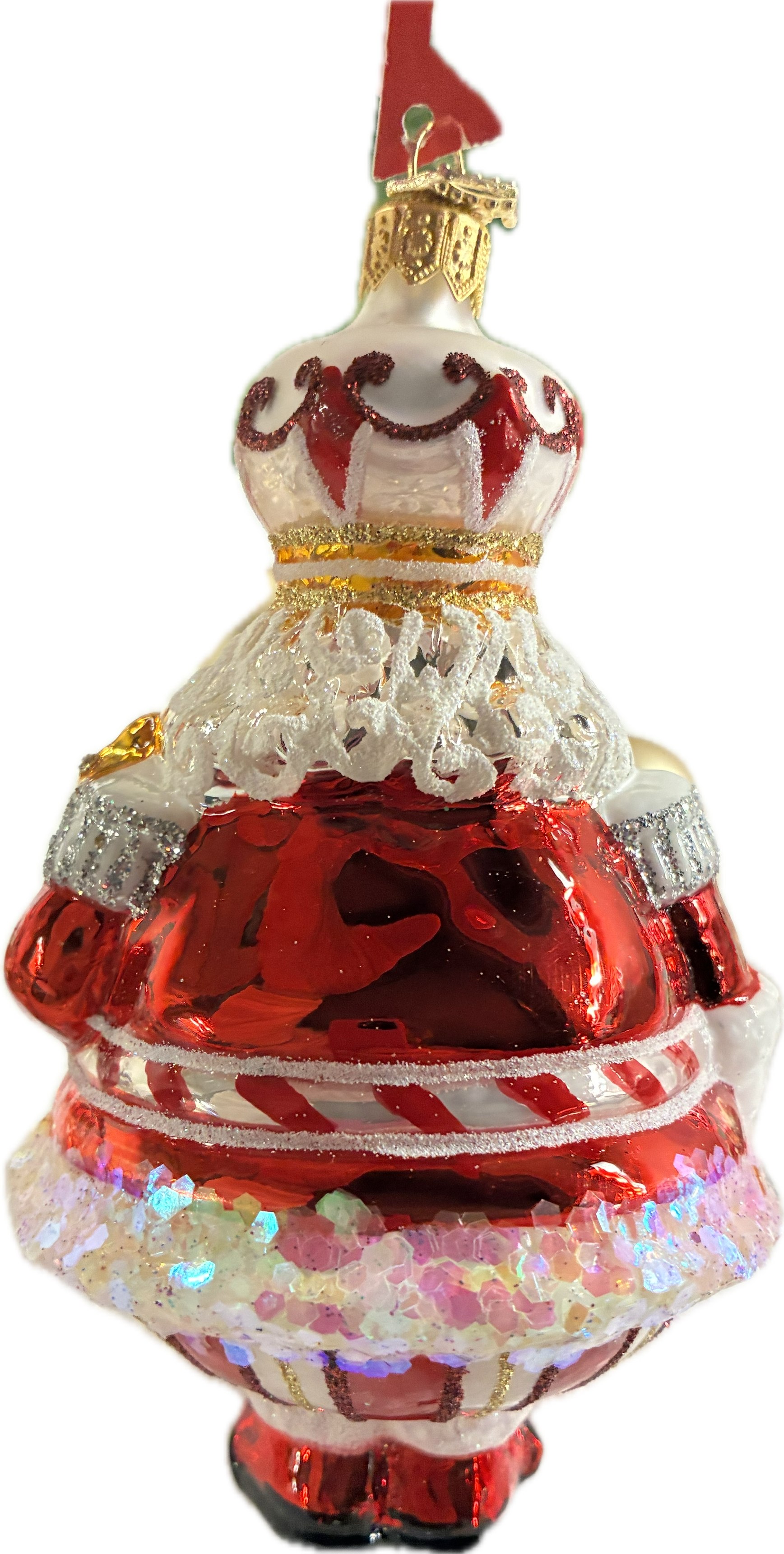 This ornament is mouth blown and hand painted by skilled artisans in Poland. He is wearing red and white striped pants and a bright red jacket sprinkled with chunky glitter. He is topped off with a crown. Measures 5.5 inches tall and 3.5 inches wide.