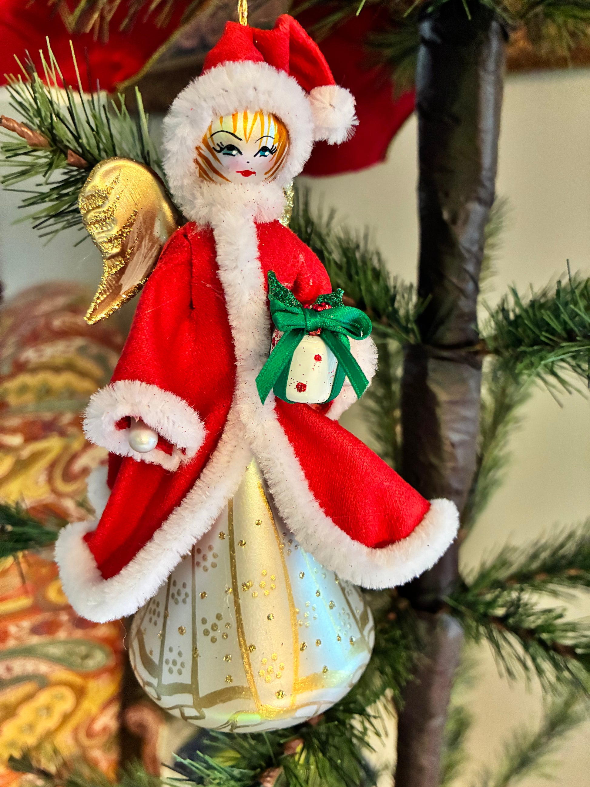 This beautiful Angel is disguised and is carrying a gift. Her beautiful wings are peeking out of her red cape trimmed in white chenille. Hand crafted in Italy. Measures 6 inches tall and 3 inches wide.