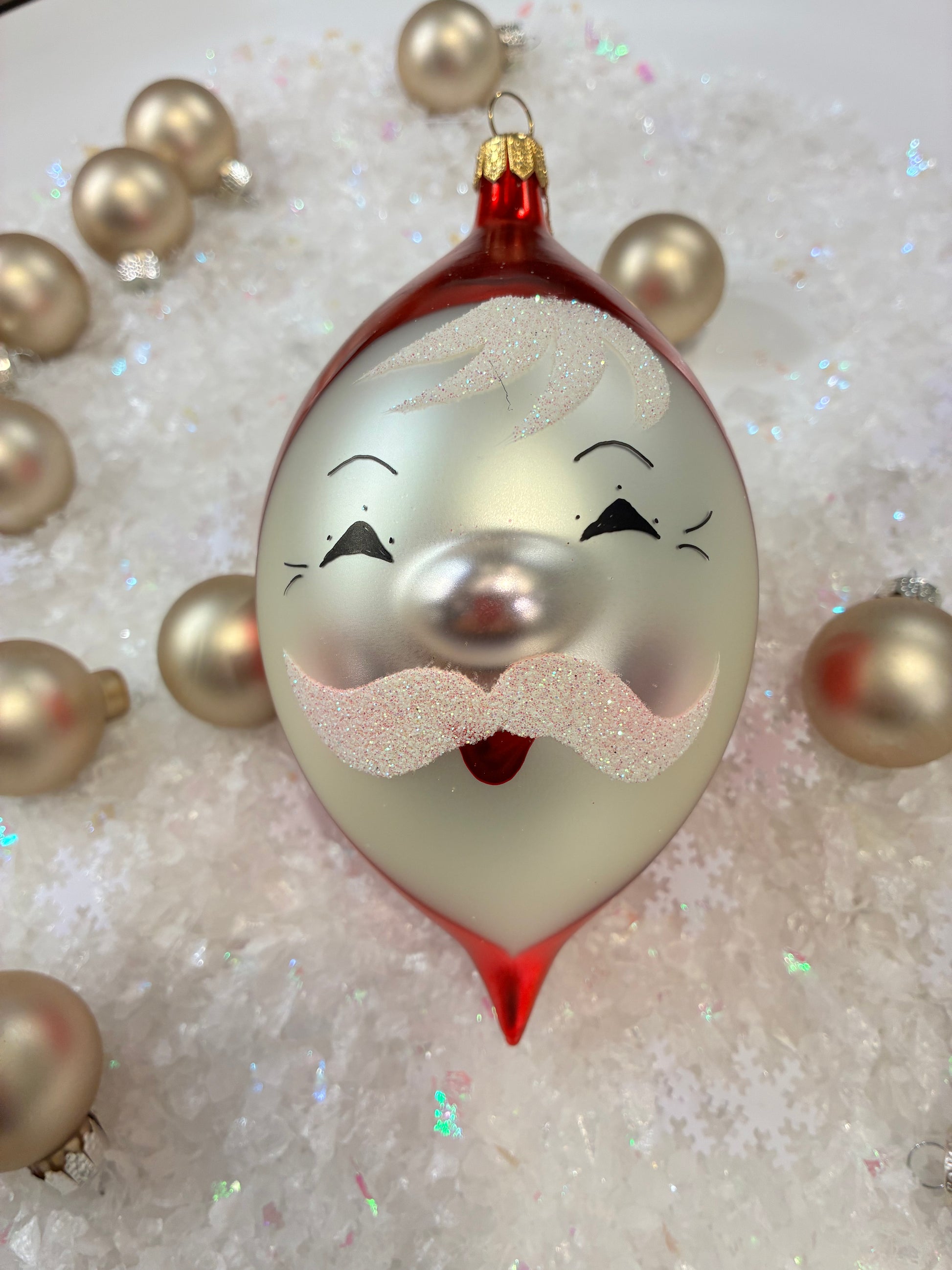 This quirky Santa ornament features a Santa face with a glittered mustache and hair. His red "hat" is a brushed shiny finish. Hand crafted in Italy. Measures 6 inches tall and 3 inches wide.