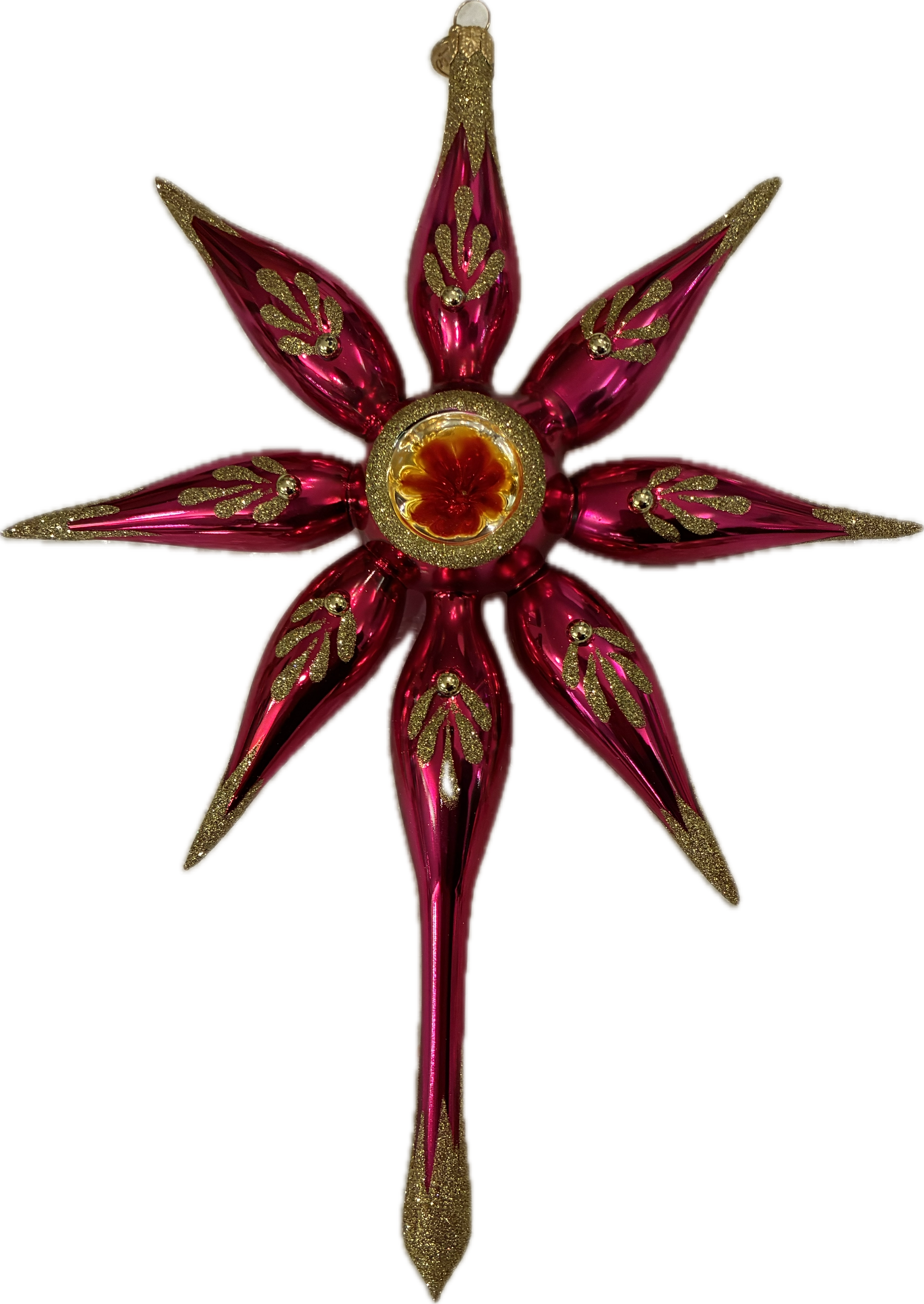 This radiant glass ornament is handcrafted in Poland with masterful glass blowing techniques. This shimmering decoration is a vibrant fuchsia accented with golden beads and glitter and a golden reddish reflector in the center. This is a luxurious addition to any Christmas tree. Measures 9.5 inches tall and 7 inches wide.