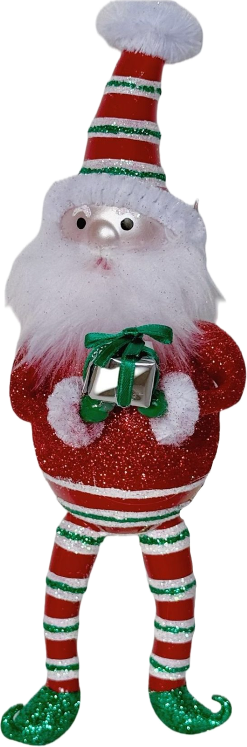 "Aldo the elf is full of laughter and joy, this happy fellow has been mistaken for a toy." This fun and whimsical ornament is hand crafted in Italy. He is a delight in his candy striped pants and hat. His little green slippers are precious. He is bringing a gift to those who least expect it! Measures 8 inches tall and 3 inches wide.