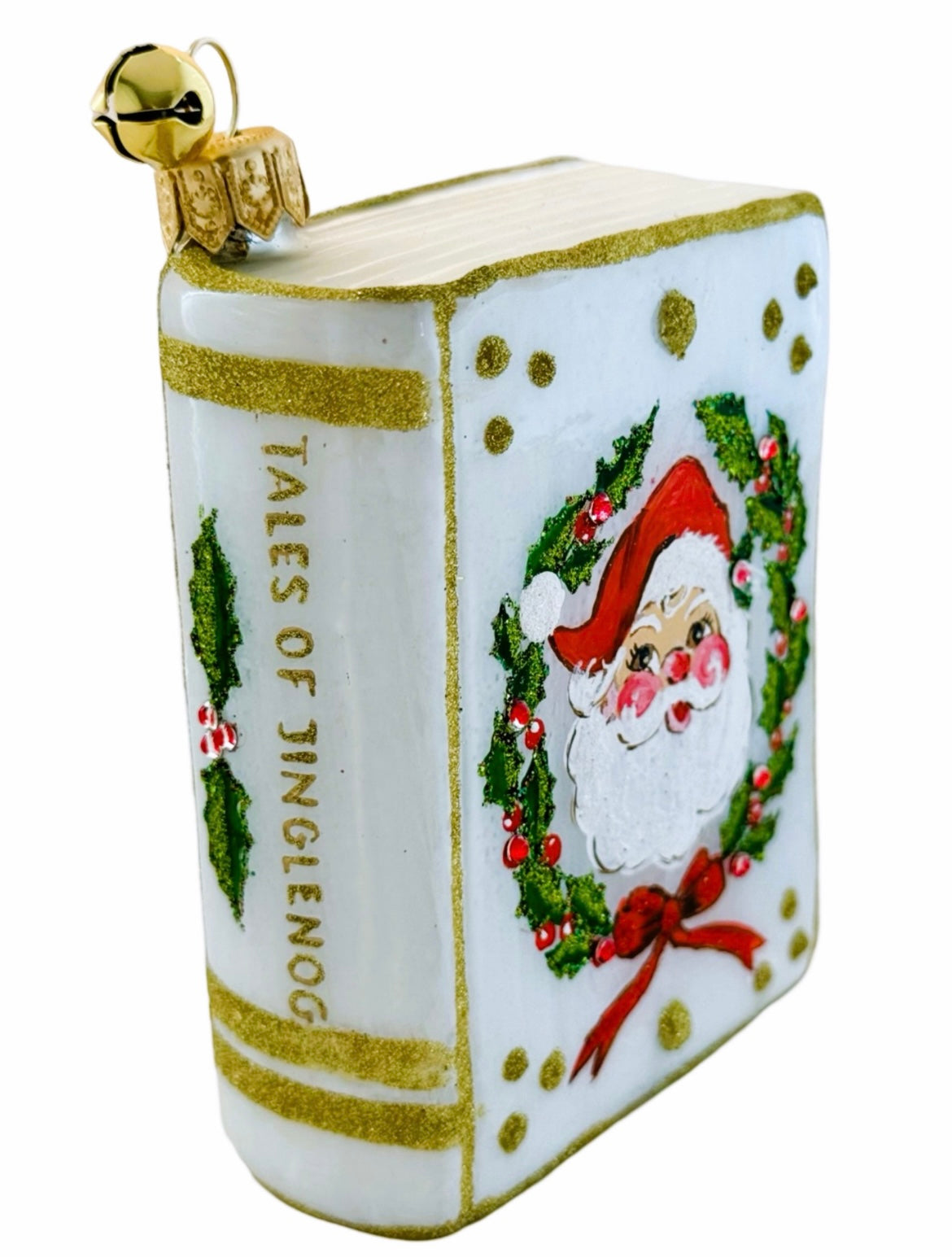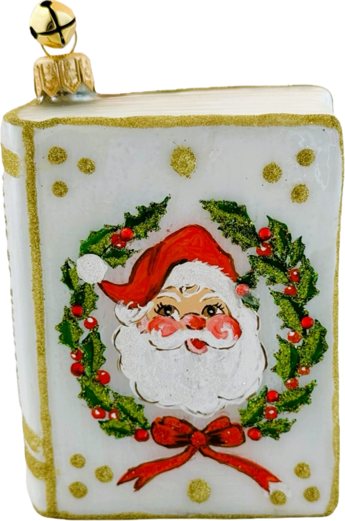 This delightful ornament features a hand painted blown glass Santa and Christmas Wreath on the cover of a "book". Hand crafted in Poland. Measures 3.5 inches tall and 3 inches wide.